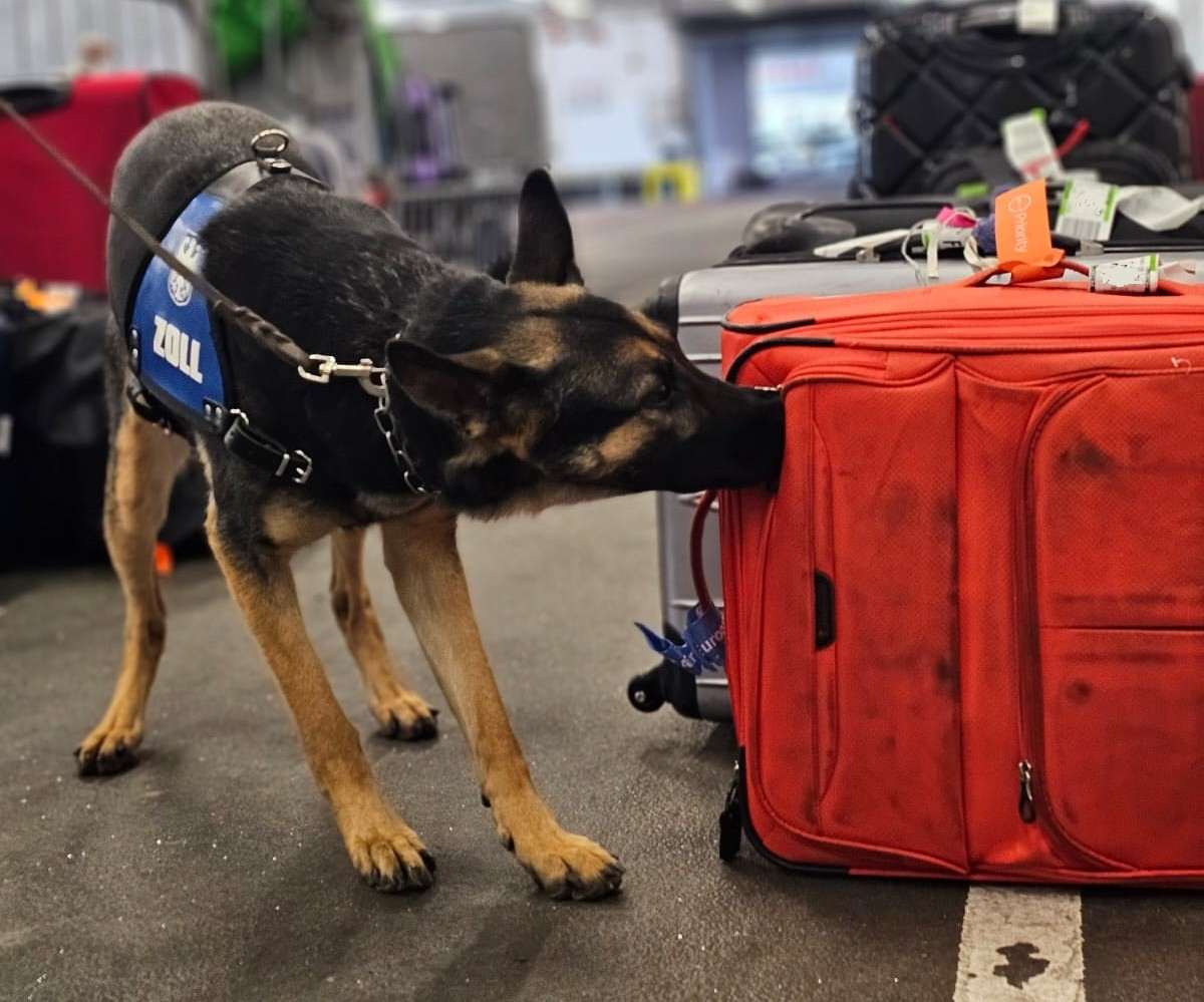 150 Kilogramm Cannabis durch Frankfurter Flughafenzoll beschlagnahmt, drei Rauschgiftspürhunde erschnüffeln Rauschgift in sechs Koffern. Am 17. Februar beschlagnahmte der Zoll am Frankfurter Flughafen insgesamt 150 Kilogramm Cannabiskraut in sechs Reisekoffern aus Thailand. Bei der Kofferabsuche zeigten drei Rauschgiftspürhunde nacheinander insgesamt sechs Koffer an, in dem sie davor verharrten. Bei der anschließenden Röntgenkontrolle erkannten die Beamten einzelne in Folie gewickelte Päckchen.