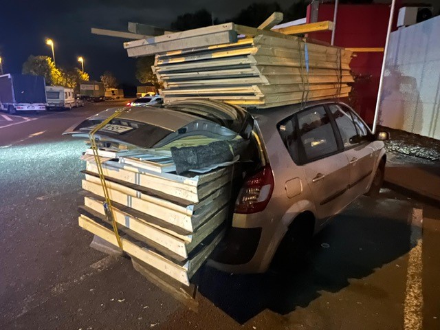 Nachdem der Renault auf der Raststätte Medenbach angehalten wurde, erzählte der 65-jährige Fahrer aus Nürnberg, dass er eine gebrauchte demontierte Gartenhütte günstig kaufen konnte. Kurzerhand wurde der PKW zum LKW umfunktioniert und die komplette Hütte in Teilen im Fahrzeug verstaut. Mittels Waage wurde das Gewicht des Gefährtes ermittelt, und eine Überschreitung des zulässigen Gesamtgewichts von 390 Kilogramm festgestellt. Aufgrund der Überladung und den nicht fachgerecht zu sichernden Ladungsteilen wurde dem Fahrer die Weiterfahrt untersagt.