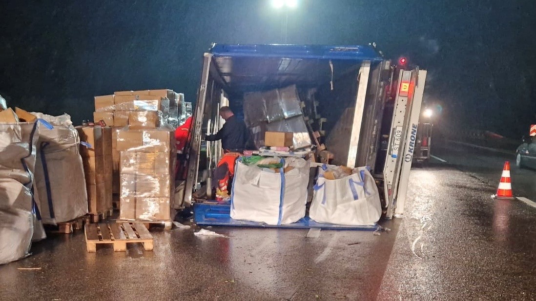 Verkehrsunfall mit umgestürztem Sattelzug und verletztem Fahrer, Wiesbaden - Am Montag, 30.09.2024 gegen 17:30 Uhr befährt ein Sattelzug aus Litauen, beladen mit ca. 8 Tonnen Paletten Bettwäsche (verpackt, zum Verkauf bestimmt) die BAB 3 in Fahrtrichtung Frankfurt und kommt mutmaßlich wegen nicht angepasster Geschwindigkeit auf regennasser Fahrbahn kurz vor dem Parkplatz Theißtal-West ins Schlingern.