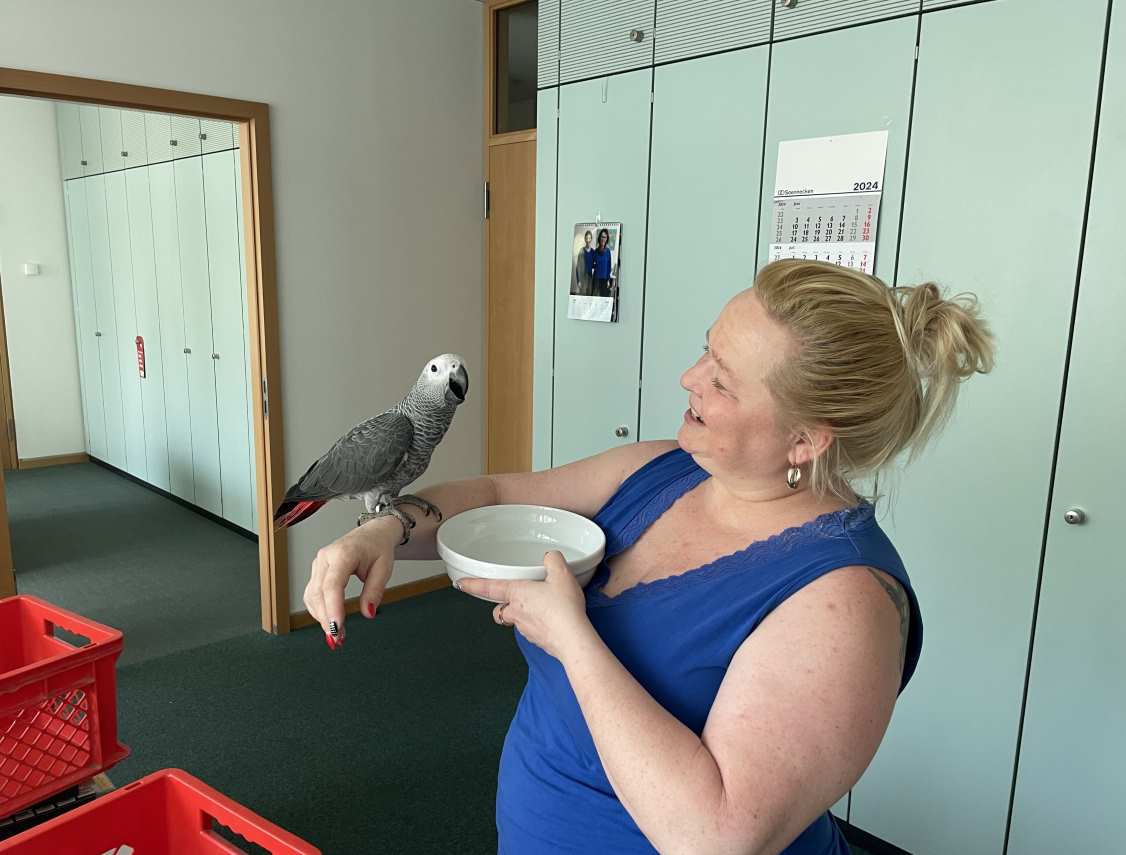 Papageienrettung im Stadthaus Große Bleiche Mainz - Einen ungewöhnlichen Gast durften die Mitarbeitenden der Stadtverwaltung am Mittwochmittag im Stadthaus Große Bleiche begrüßen: ein Graupapagei hatte sich ins Stadthaus 'verflogen'. Ob er einen Termin bei Oberbürgermeister Haase vereinbaren wollte oder Nachschub an gelben Säcken holen wollte, ist leider nicht bekannt.