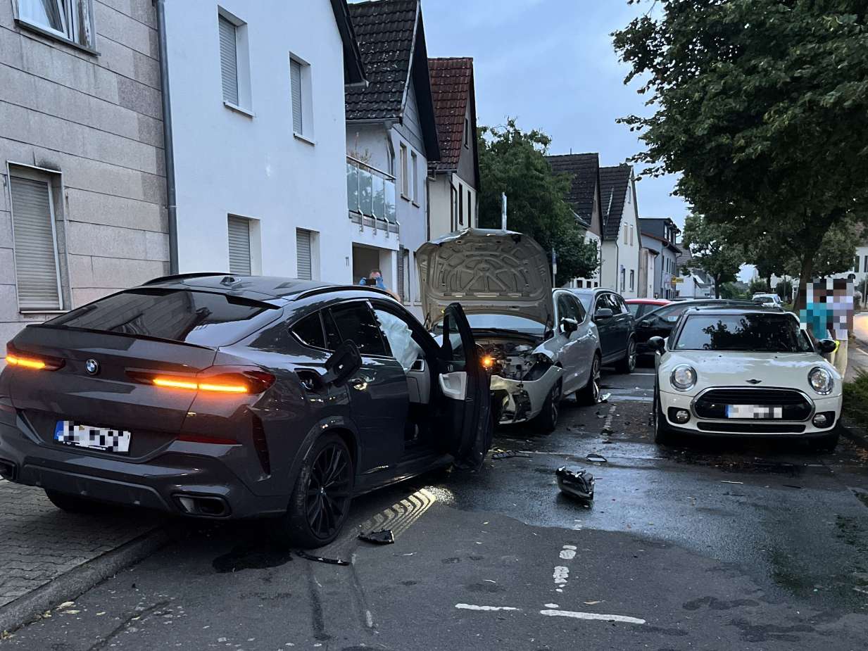 Über 230.000 Euro Sachschaden bei Verkehrsunfall: BMW-Fahrer schiebt vier andere Autos zusammen und verletzt sich, Schöneck - Ganz offensichtlich heftig gekracht hat es am Montagmorgen in der Südlichen Hauptstraße in Büdesheim. Dort war ein 20 Jahre alter BMW-Fahrer gegen 5.20 Uhr in Richtung Nidderau unterwegs, als er nach links von der Fahrbahn abkam, zunächst einen Grünstreifen überfuhr und dabei einen Baum streifte. Anschließend prallte der X6 gegen einen geparkten Volvo XC60.