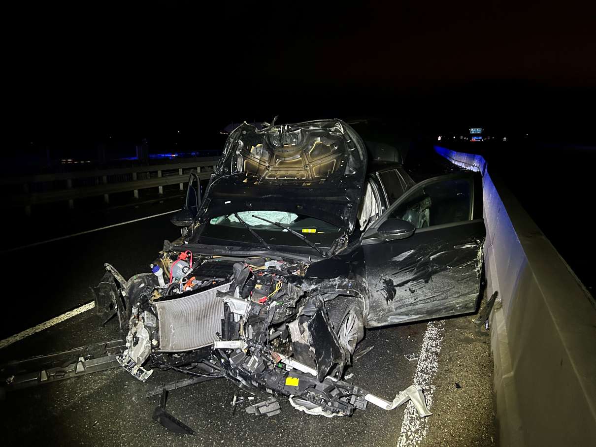 PolizeifotoVerkehrsunfall mit drei verletzten Personen; Vollsperrung der A643 in Fahrtrichtung Autobahndreieck Mainz auf unbestimmte Zeit, Ingelheim am Rhein - Am Sonntag, den 26.01.2025, um 03:44 Uhr ereignete sich ein Verkehrsunfall auf der A643, Fahrtrichtung Autobahndreieck Mainz, auf Höhe der Anschlussstelle Mombach. Der 31-jährige Fahrer eines Peugeot e2008 kollidierte aus bislang noch ungeklärter Ursache mit der Betongleitwand auf der Schiersteiner Brücke.