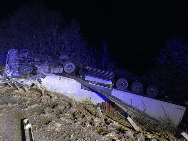 Verkehrsunfall mit Personenschaden, umgestürzter Sattelzug, A3, zwischen Idstein und Bad Camberg, Donnerstag, 09.01.2025, 21:42 Uhr, Wiesbaden - Am Donnerstagabend durchbricht auf der A 3, zwischen Idstein und Bad Camberg, ein mit 26 Tonnen Mandarinen beladener marokkanischer Sattelzug die rechte Schutzplanke der Autobahn und stürzt im Böschungsbereich neben der Fahrbahn um.