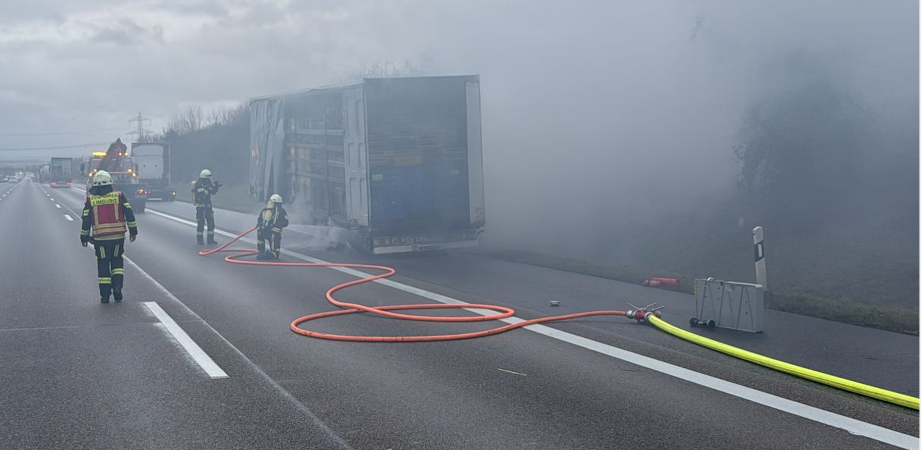 LKW-Brand auf der A3 im Bereich der Stadt Limburg Wiesbaden - Am späten Donnerstagmorgen 09.01.2025 um 10:58 Uhr befuhr ein tschechischer Sattelzug die A3 in Richtung Süden. Im Bereich der Anschlussstelle Limburg-Süd blockierte das Radlager an der linken Seite der 3. Achse des Sattelaufliegers, wodurch dieses sich stark erhitzte und schließlich einen Brand des Reifens verursachte.